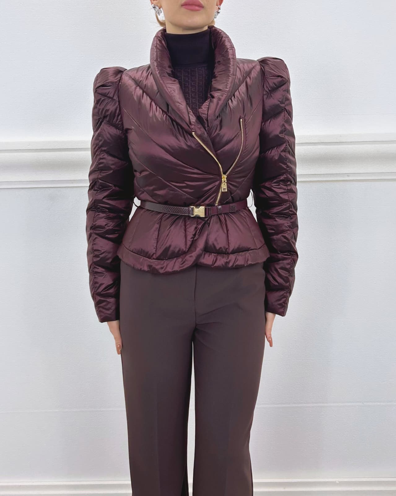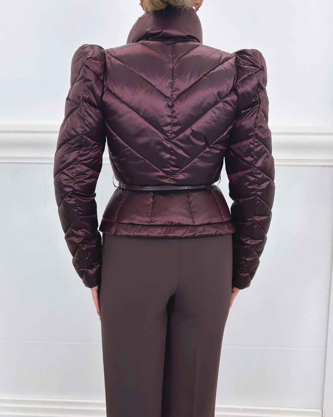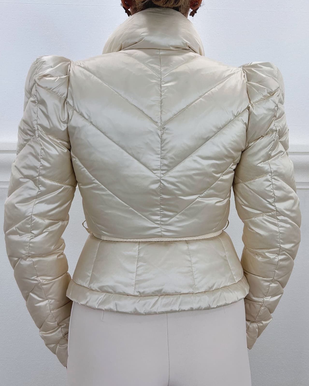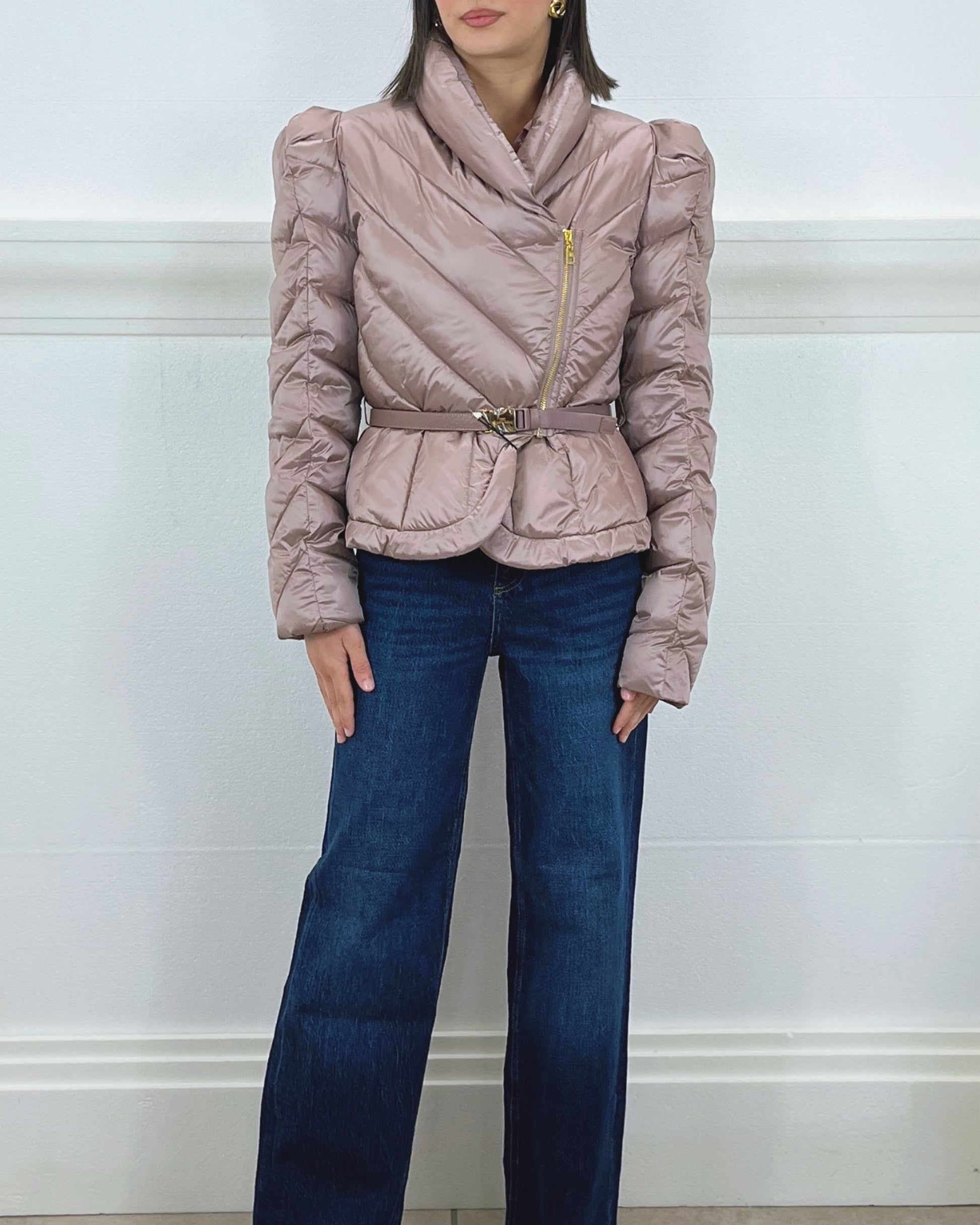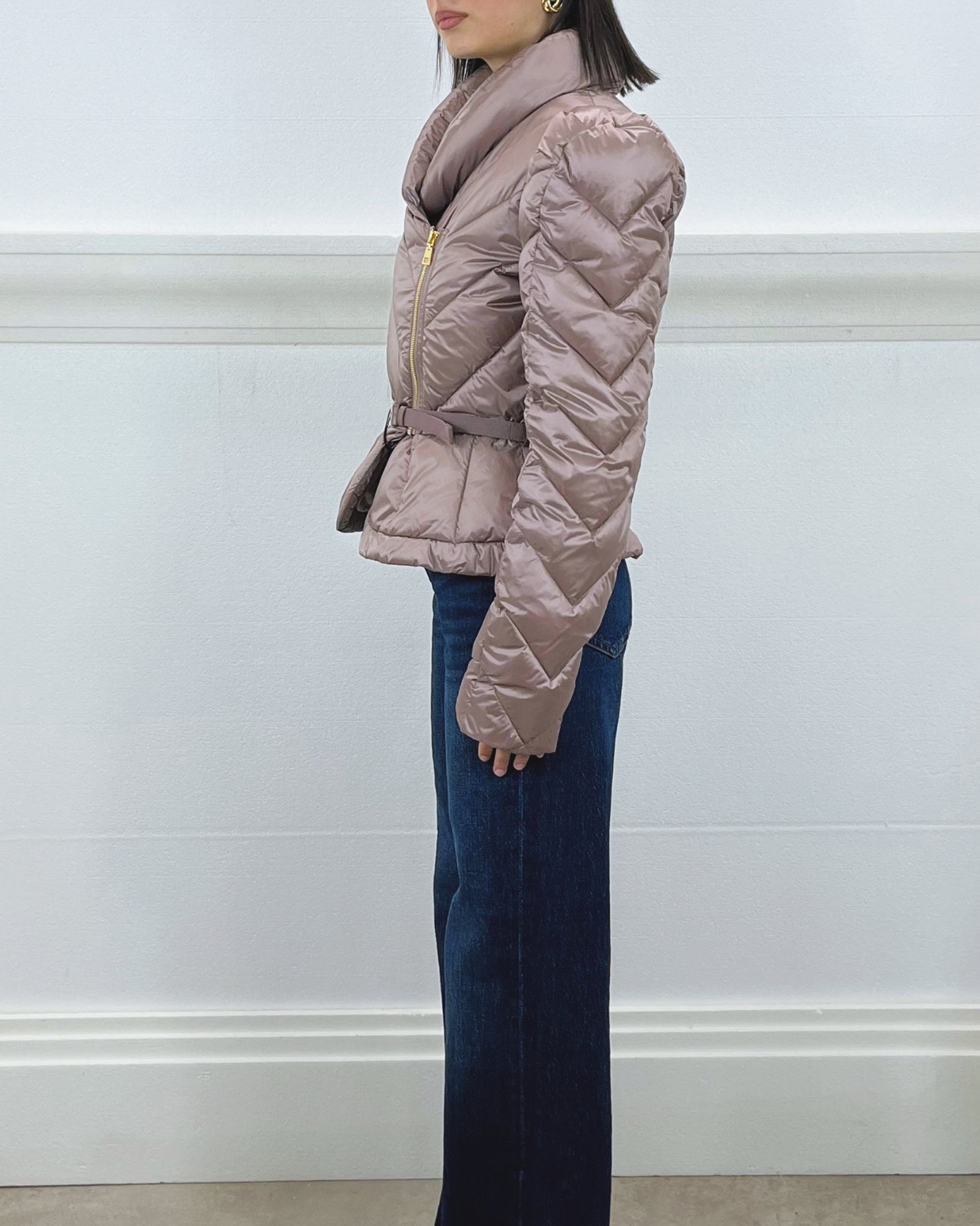 Piumino corto in tessuto vela dalla luminosa texture cangiante. Imbottito e trapuntato con motivi chevron, si distingue per il collo alto sovrapposto e per le maniche con spalle bombate dai leggeri motivi di arricciatura. La baschina definita dalla cintura con fibbia esalta la linea femminile del capo. Vestibilità slim.