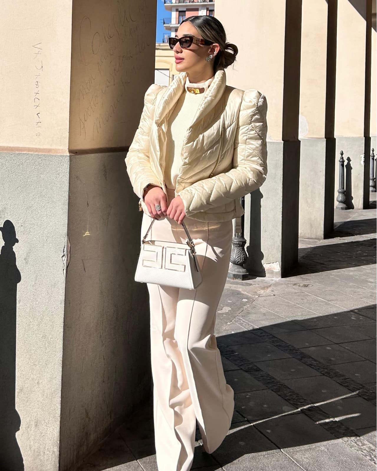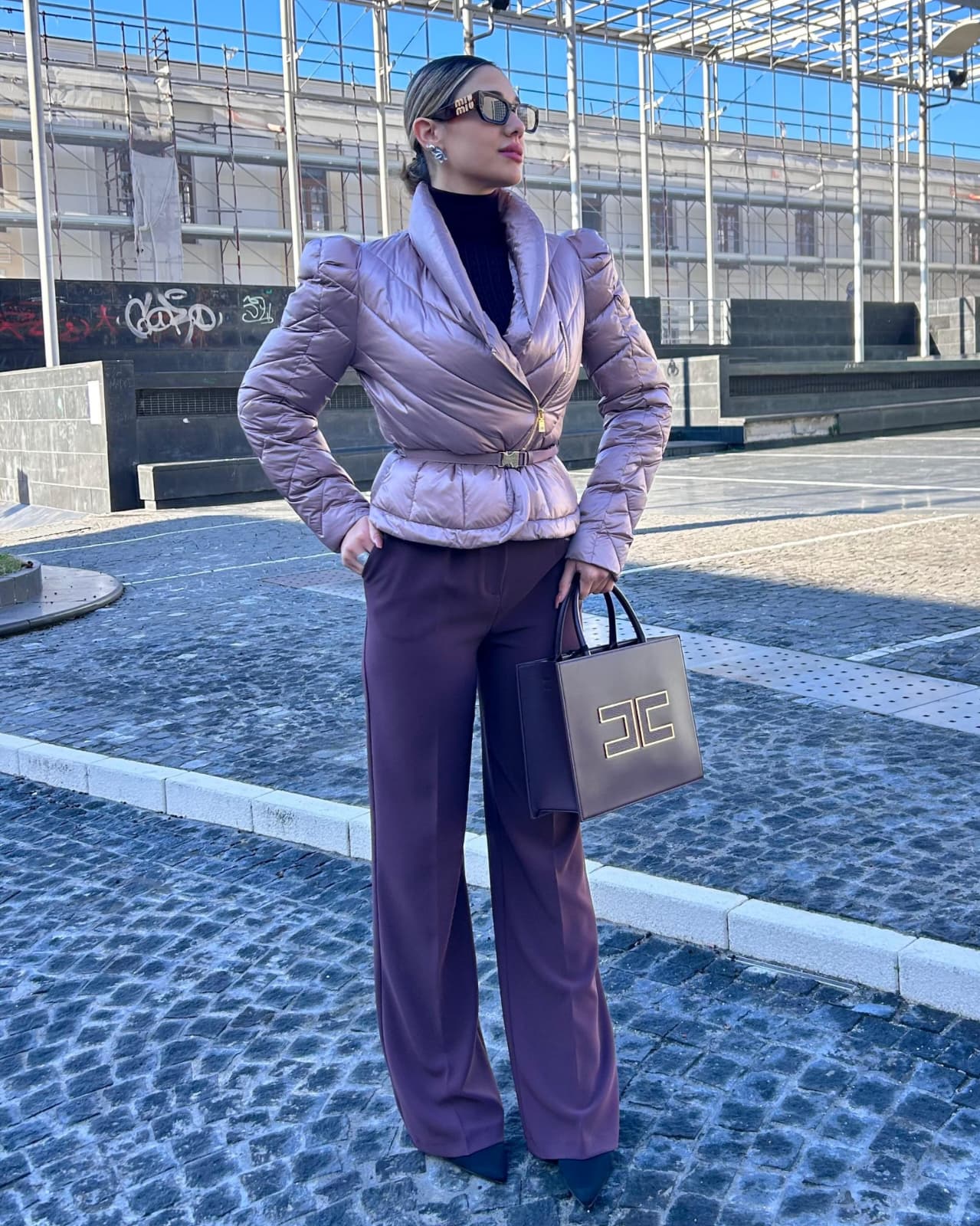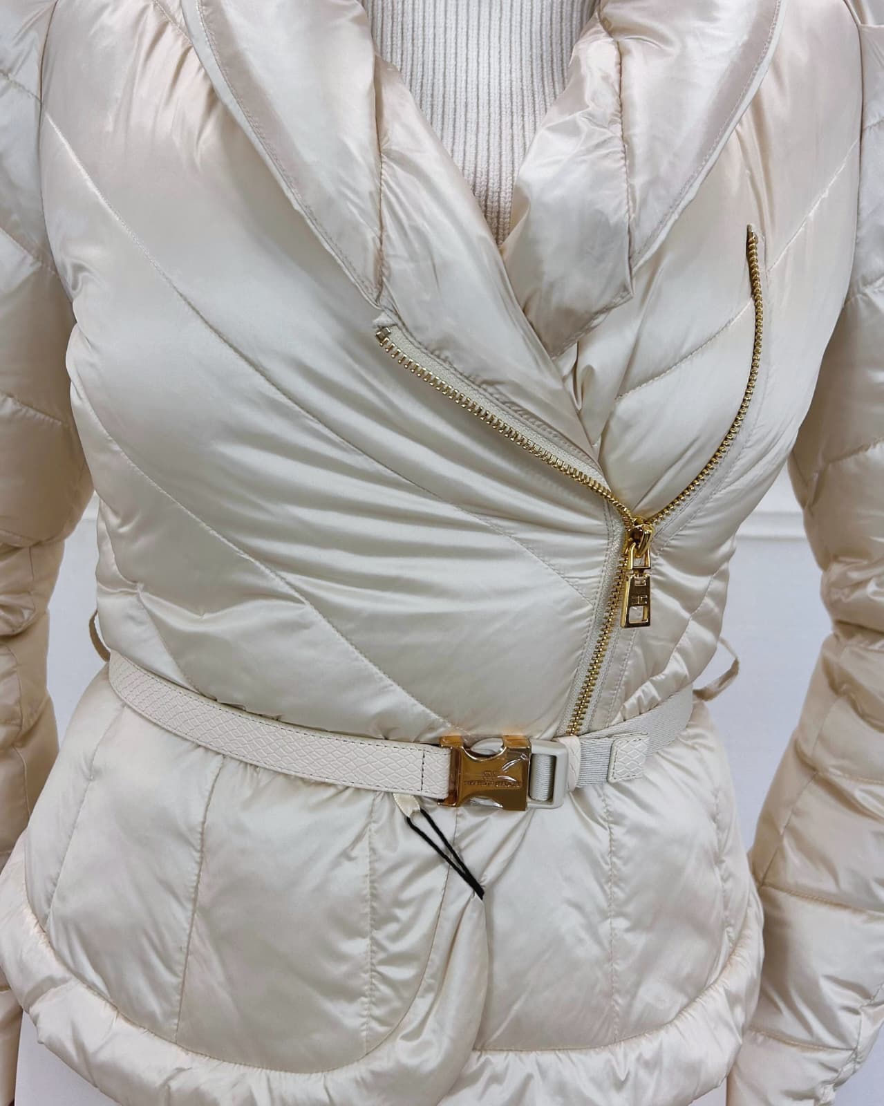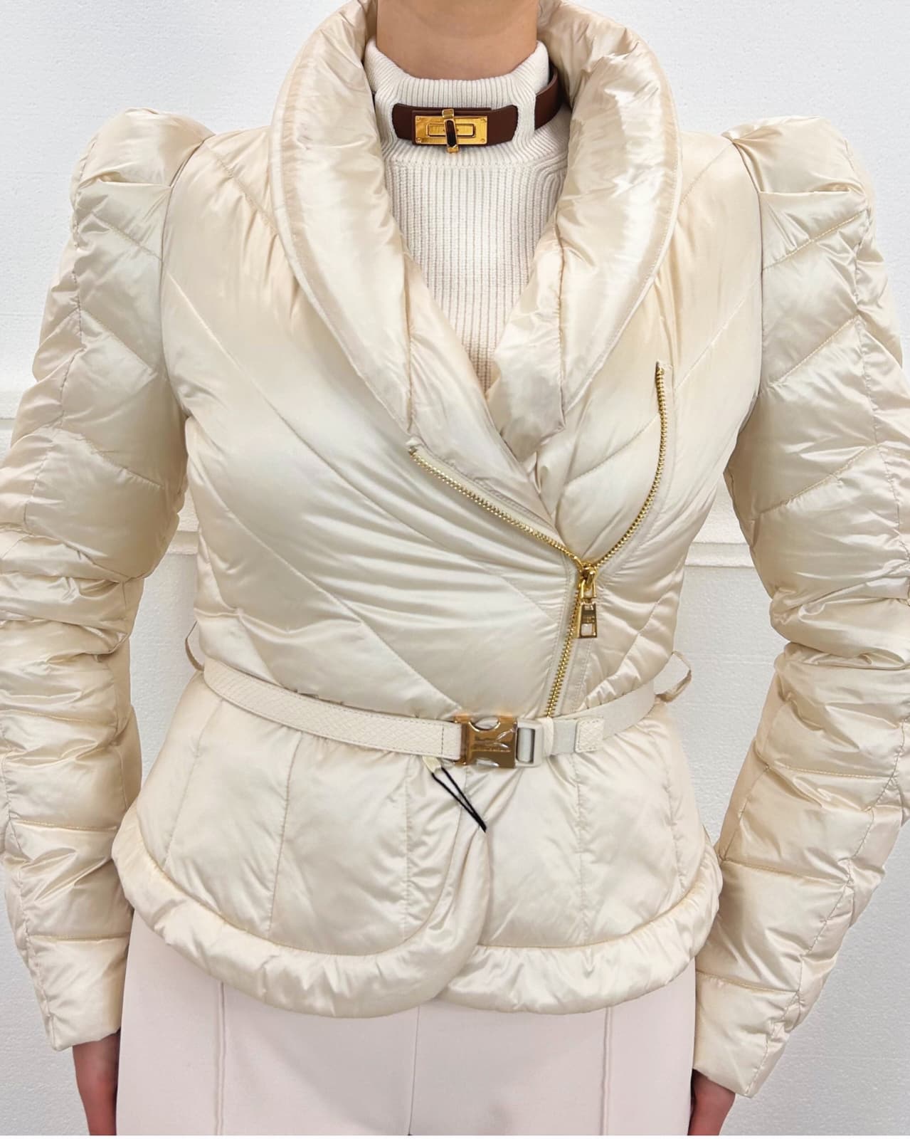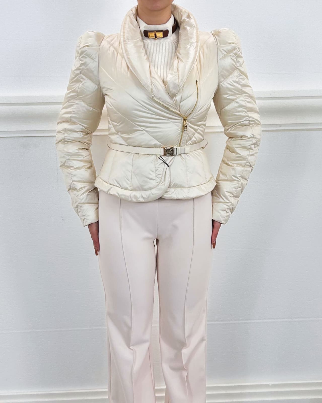 Piumino corto in tessuto vela dalla luminosa texture cangiante. Imbottito e trapuntato con motivi chevron, si distingue per il collo alto sovrapposto e per le maniche con spalle bombate dai leggeri motivi di arricciatura. La baschina definita dalla cintura con fibbia esalta la linea femminile del capo. Vestibilità slim.